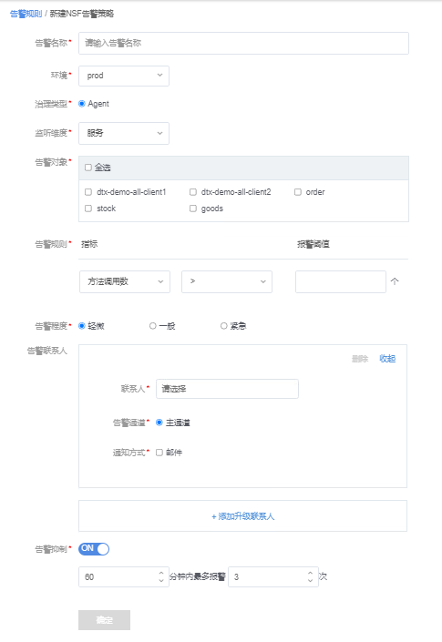 微服务治理平台,可以针对微服务、应用监控、分布式事务、API网关设置告警。告警规则支持与和或操作,监测粒度(统计周期)为1分钟。若一分钟的监测指标触发告警条件,通过邮件和短信通知到联系人。