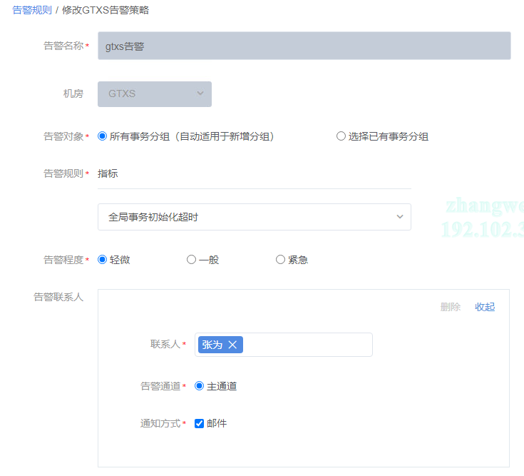 在告警规则的如“GTXS”tab列表页,点击“修改”,跳转到修改页,如下图: