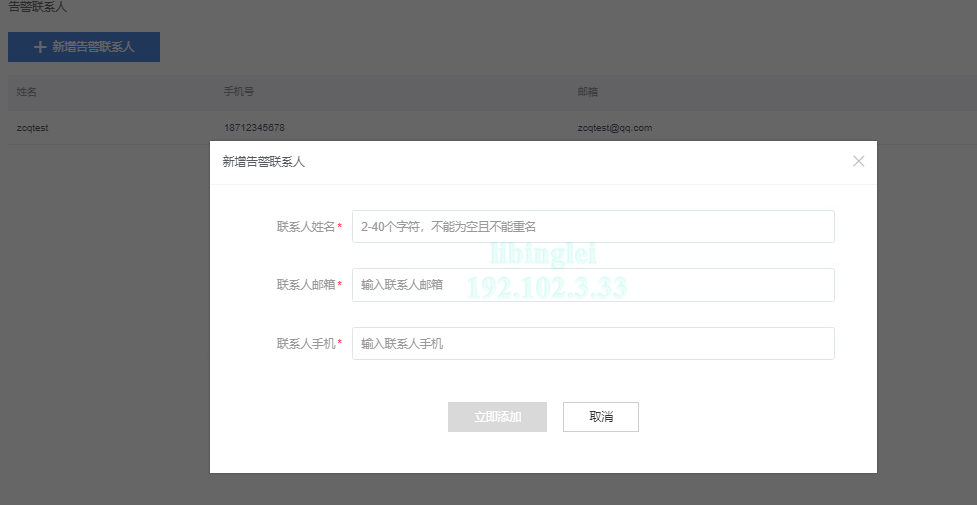 功能描述: 在当前租户下添加告警联系人信息