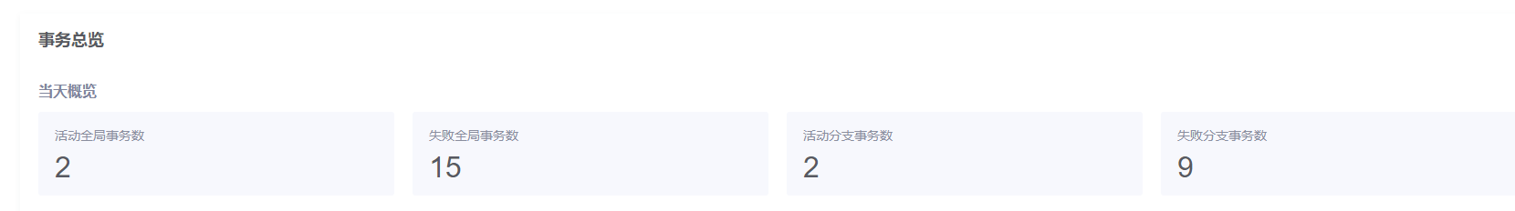 在概览页面可以查看当前项目下的当天事务监控信息,包括活动全局事务数、失败全局事务数、活动全局事务分支数、失败全局事务分支数