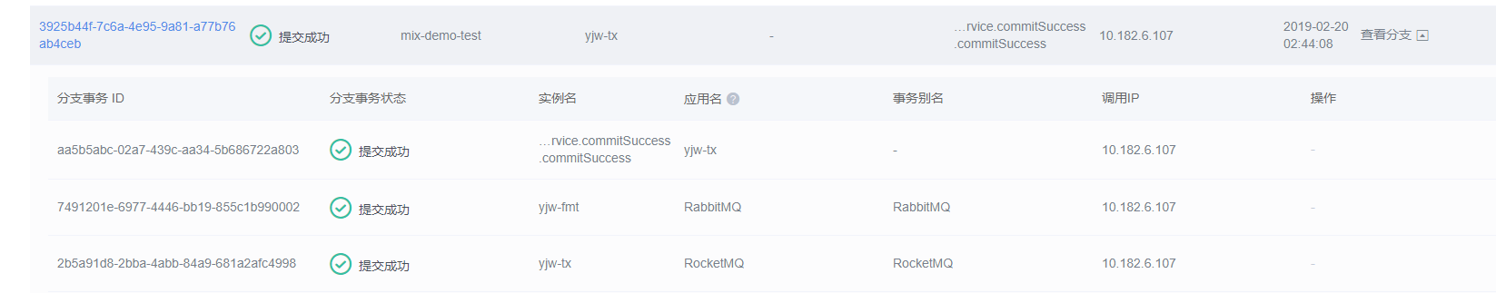点击全局事务中的应用名称,可查看相应的全局事务信息和事务轨迹