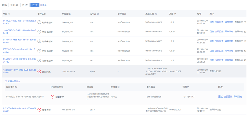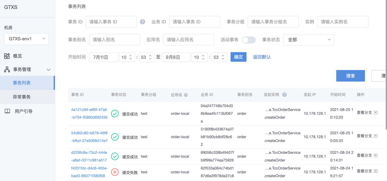 在全局事务管理中您可以查看全局事务及其对应的分支事务的列表,查看全局事务及其状态,并通过一定的条件筛选和搜索出符合条件的全局事务。