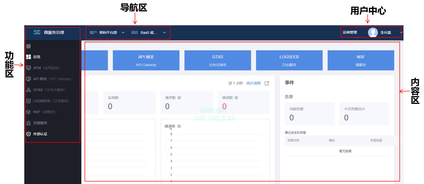 导航区:展示当前登录用户所在租户及项目,可切换租户和项目