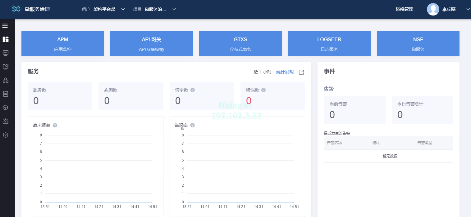 服务部分中包括近1小时服务数、实例数、请求数、错误数及请求频率、错误率等指标图像化展示。