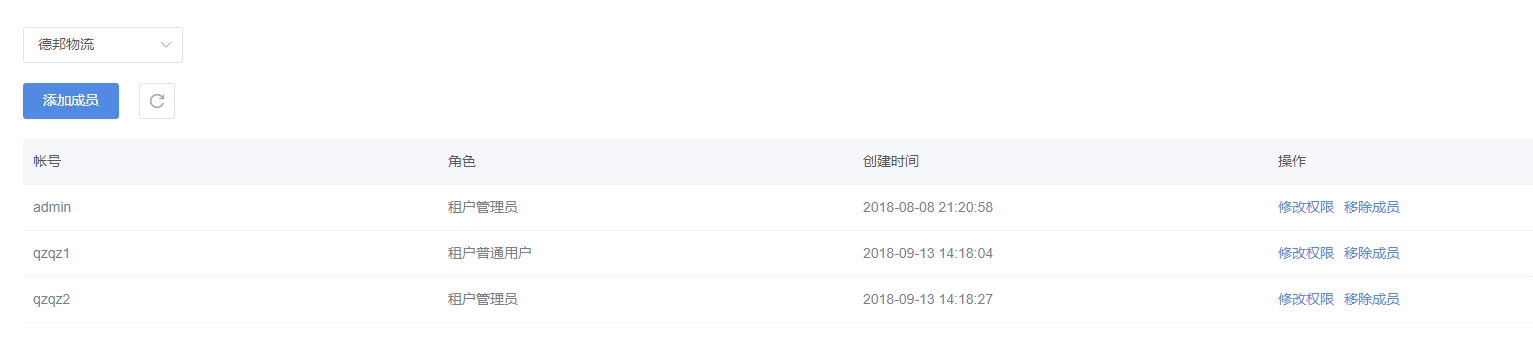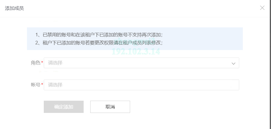 平台管理员和租户管理员可以为租户添加成员,可以为成员指定不同的权限,其中租户管理员具有该租户和租户下所有项目的管理权限,租户普通用户具有租户下的使用权限,租户普通用户不具有租户下项目的权限。