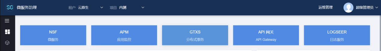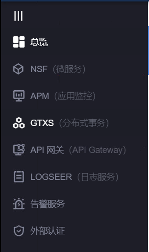 光标移到左侧会展开微服务治理平台主导航,主导航中包括了各个产品模块入口,以及横向模块入口,如告警服务、外部认证等。