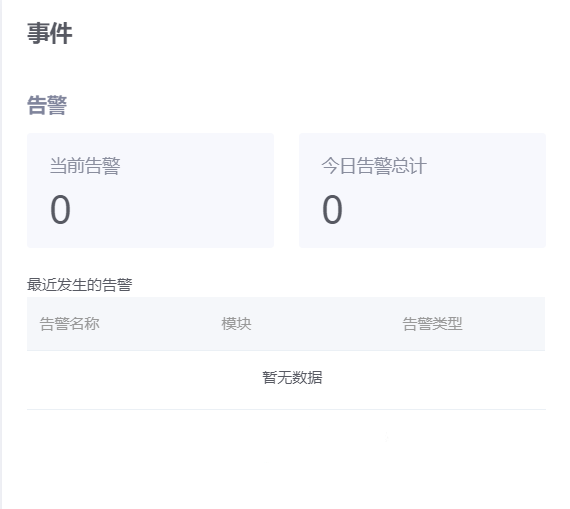事件部分包括当前告警数量、今日告警总计、最近发生的告警列表。