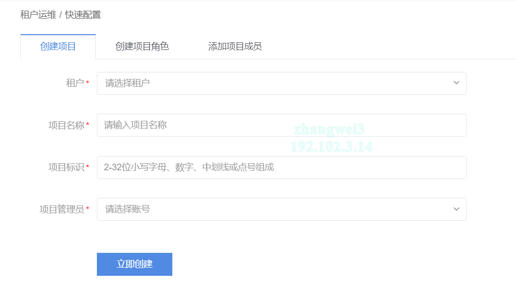 租户管理员可以通过快速配置功能集中完成租户运维操作,在该页面下完成创建项目、创建项目角色、添加项目成员等操作。